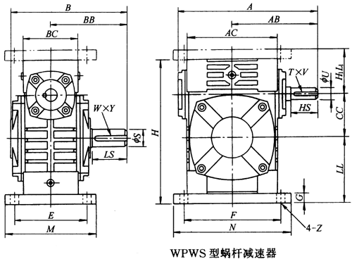 WPWS40、WPWS50、WPWS60、WPWS70、WPWS80、WPWS100、WPWS120、WPWS135、WPWS155、WPWS175、WPWS200、WPWS250、型蜗轮蜗杆减速器主要尺寸