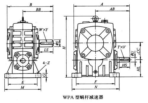 WPA40、WPA50、WPA60、WPA70、WPA80、WPA100、WPA120、WPA135、WPA155、WPA175、WPA200、WPA250、型蜗轮蜗杆减速器主要尺寸