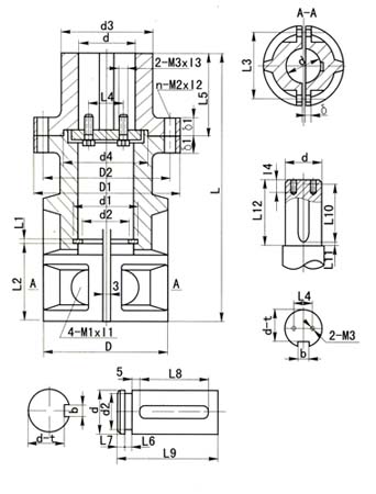 | 标定符号 | 孔径 | 许用扭矩 | 最高转速 | L | M1×I1 | D | D1 | D2 | L1 | L2 | L3 | δ | d1 | d2 | n-M2×I2 | D3 | d4 | L5 | δ1 | M3×I3 | 重量(kg) |