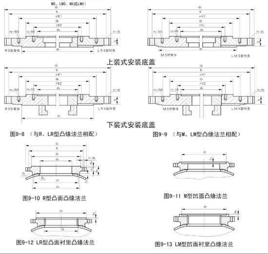本系列安装底盖可与XD与型、XS型机架及2000系列机械密封火506、516、616型填料箱相配套,底盖下面与R型、LR型、M型、LM型凸缘法兰相配套,用户根据XD型、XS型机架及凸缘法兰的规格选择相应的安装底盖,若配用其他型号机架、机械密封、填料箱,只需将一下标记中序号换成外径d,注上相应机架型号即可。