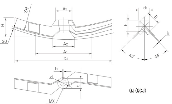 | DJ | d | d1 | h | SR | H | A1 | A2 | A3 | 键槽 | B | MX | δ | 重量 | ||
