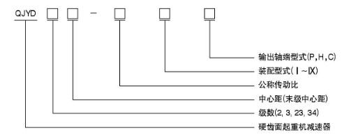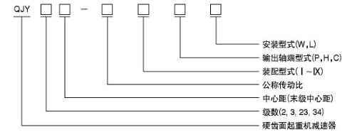 起重机减速器三级传动,名义中心距ai=560mm,公称传动比50,装配型式第111种,输出轴端为齿轮轴端,卧式安装则标记为:QJY3560-50IIICW