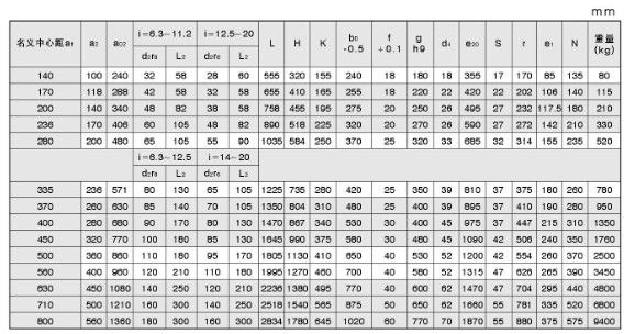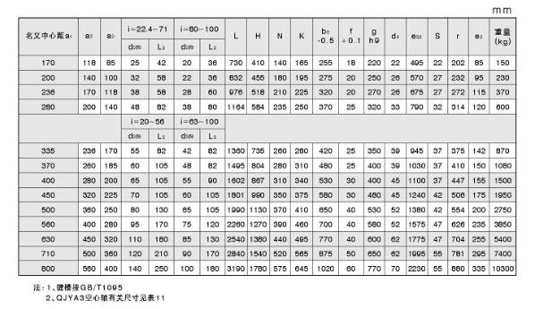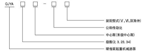 起重机减速器二级传动,名义中心距a,=560mm,公称传动比i=20,第Ⅳ种装配型式,轴端型式为P型的标记为:QJYD2560-20ⅣP。
