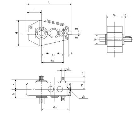 注:a。角的度数与传动比有关,当减速器倾斜a角时,应保证使中间级大齿轮浸油1-2个齿高深度(αo具体数据由用户自定)。