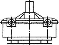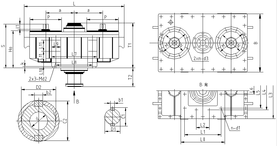 单级三环传动;二高速轴平行对称位于低速轴两侧,各轴垂直地面,箱体平置,座装,端面剖分;附加标号P